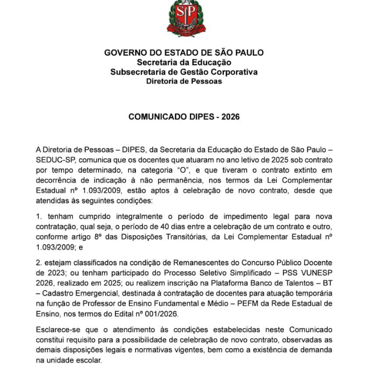 A conquista inclui professores que passaram pela quarentena, fizeram o processo seletivo simplificado em 2025, são remanescentes do último concurso público ou se inscreveram no banco de talentos. Todos serão reclassificados, podendo assim participar da atribuição de aulas, como é chamado o momento em que os docentes montam sua jornada de trabalho.