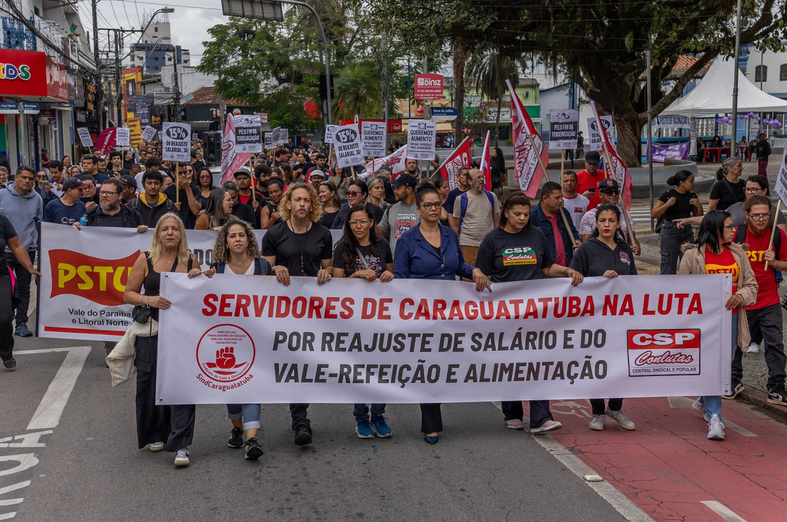Cerca de mil servidores municipais de Caraguatatuba entraram em greve de 24 horas, nesta quinta-feira (28), e realizaram uma das maiores manifestações dos últimos anos na cidade. Os servidores reivindicam, principalmente, 15% de reajuste salarial e aumento nos vale-refeição e alimentação.